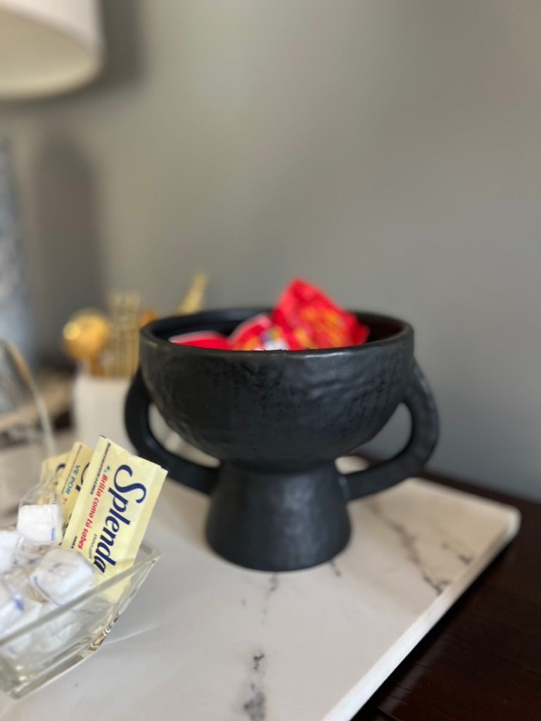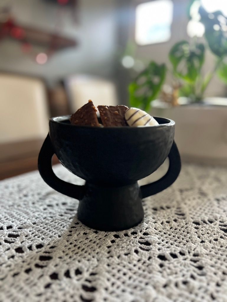 Minimalista, escultórico y con mucha presencia. El tazón Mitla en cerámica negra mate texturizada tiene una silueta tipo cáliz con asas redondas que lo convierten en una pieza protagonista. Úsalo como acento decorativo en consola, mesa de centro o comedor, o como contenedor para darle un toque moderno y sofisticado a tu espacio.